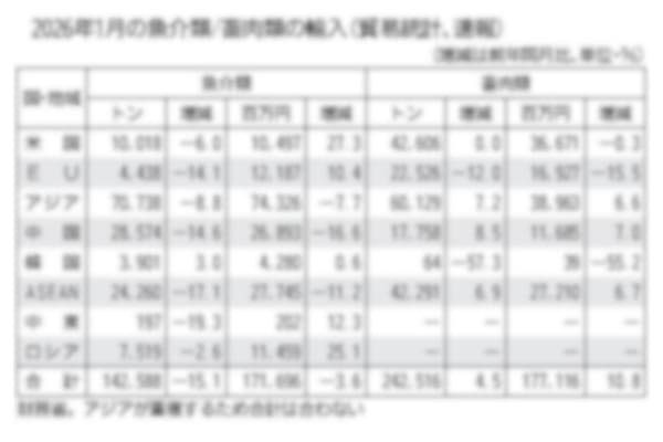 米国海洋大気庁(NOAA)の貿易統計によると、米国昨年11月の水産物輸入は数量が前年同月に比べて引き続き1割以上減少した。トランプ関税の影響や需要の低下が顕在化しているものとみられる。(別表参照)…