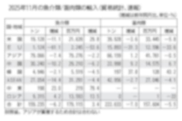 財務省が17日に発表した貿易速報によると、11月の魚介類(非食用水産物を除く)の輸入は、数量は2か月連続の減少となったが、金額は4か月連続の増加で単価高基調が顕著だった。世界的な魚価高と円安が重な…