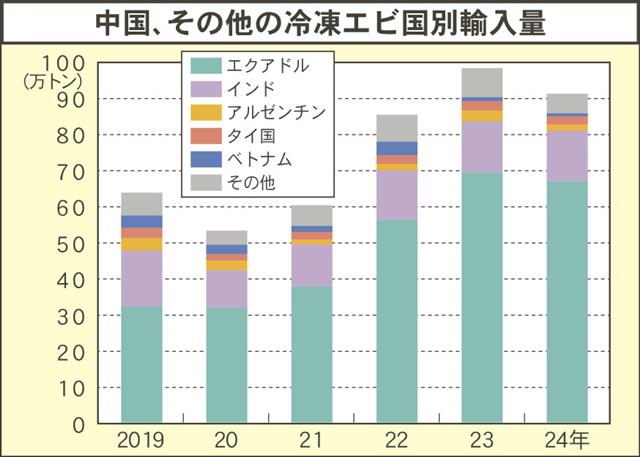 中国の税関に当たる海関総署が発表した2024年の冷凍エビの輸入量は、前年比7%減で世界最多の98万1705トン、金額は16%減の49億6203万ドルだった。輸入量を伸ばし続け、前年は100万トンを…