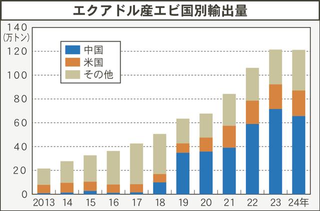 エクアドルの国立水産養殖会議所が発表した2024年のエビ類輸出量は前年比0・2%減の121万1645トン、金額は3・5%減の60億6845万ドルだった。 17年の40万トンから21年は80万トン…