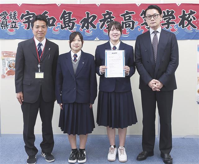 愛媛県立宇和島水産高校は欧州連合(EU)へ水産物を輸出する際に必要な施設認定を、民間企業や漁協などの団体以外で初めて取得した。東京・霞が関の農林水産省で27日、同校2年生の池田優芽さんと木村百華さ…