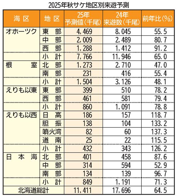 北海道の秋サケ定置網漁が解禁した。序盤は親魚確保のため、操業始期を繰り下げる自主規制措置に取り組んでいる地域も多く、水揚げの本格化は9月中旬以降になる。今年の来遊予測は昨年を35%も下回る1141…