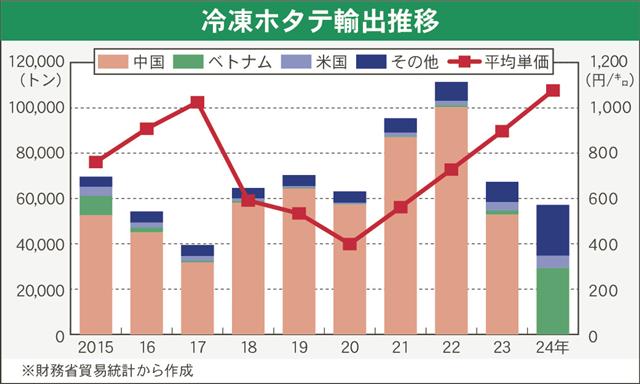 2024年度の国内のホタテ水揚げは道内が40万4000トン、東北地区を合わせた全国計で43万7000トン。前年度比3万トン減でこれは青森県の減産の影響が大きかった。道内の平均単価は約2割高のキロ2…