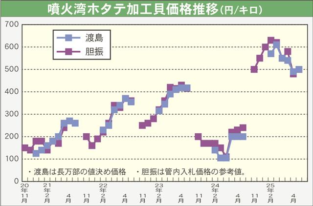 今シーズン(2024年10月~25年5月)の水揚げは昨秋、胆振地区(JFいぶり噴火湾漁協)からスタート。年明けから渡島も含めて加速し、3~4月にかけて盛漁期を迎えた。今期は「後半の貝の成長がよかっ…