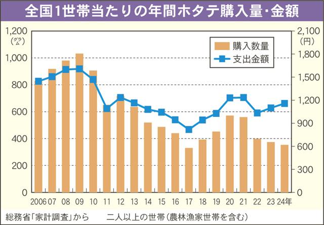 総務省の家計調査によると、昨年の全国一世帯当たりの「ほたて貝」の購入数量は、前年比6%減の353グラムと、4年連続で減少した。平均単価が12%高の100グラム当たり328円と、初めて300円を超え…