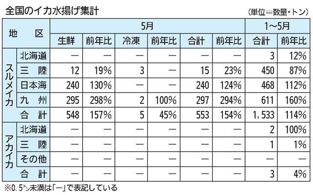 【八戸】中型イカ釣り船が北太平洋公海で生産した船凍ムラサキイカ(北太平洋アカイカ)の入札が5日に函館で、7日には八戸でそれぞれ行われた。好漁で前年を上回る供給が見込まれていることから、昨シーズン終…