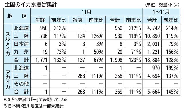 JF全漁連のまとめによると、全国の昨年11月のスルメイカ水揚げは前年同月に比べ冷凍が減少したものの、生鮮が増加し、合計で23%増の1908トンとなった。本州日本海地区・石川の一部地区が未集計のため…