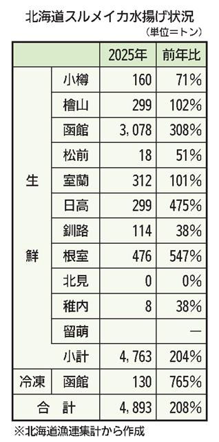 【札幌】北海道機船連によると、韓国の2025年スルメイカ漁期(25年7月~26年6月)の漁獲量は、昨年12月19日現在で実証試験枠を除いて前年同期比2・4倍の1万8035トンと好調に推移している。…