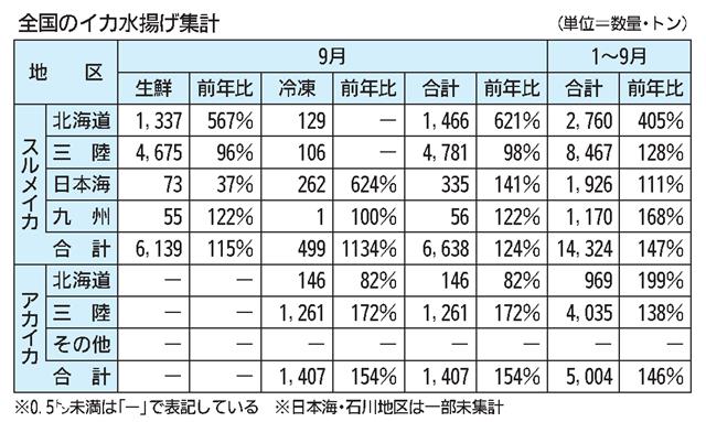 JF全漁連のまとめによると、全国の9月のスルメイカ水揚げは生鮮、冷凍合わせて前年同月比24%増の6638トンとなり、6か月連続で前年を上回った。 本州日本海地区・石川の一部地区が未集計のため、暫定…