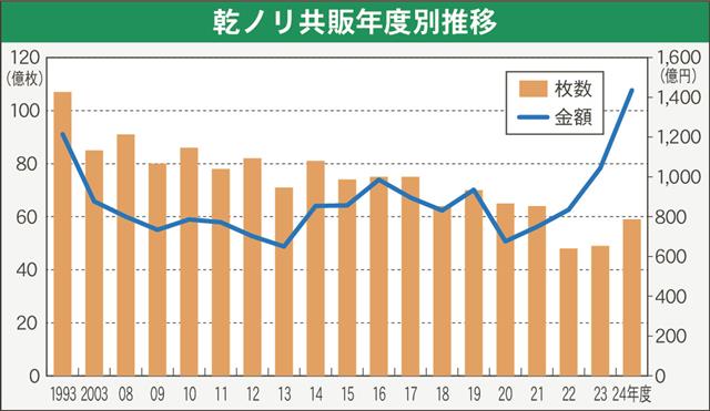 今期の乾ノリ生産が終了した。全国漁連のり事業推進協議会が12日現在でまとめた乾ノリ共販漁連別実績によると、今漁期の累計枚数は59億4978万枚で前年を21%上回ったが、相場の高騰から金額は1435…