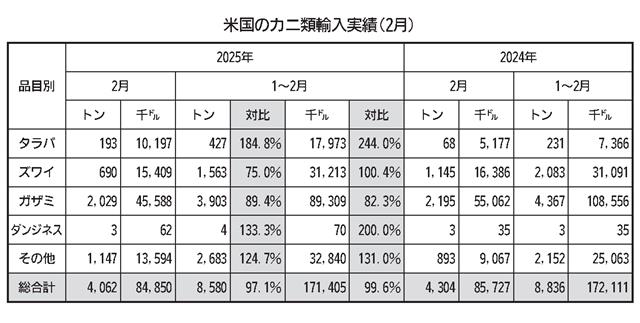 米国海洋大気庁(NOAA)の貿易統計によると、米国が2月に輸入したカニ製品はタラバ類を除いて減少した。ズワイはカナダ東海岸ニューファンドランド(NF)の端境期で現地在庫も少なく、唯一まとまっている…