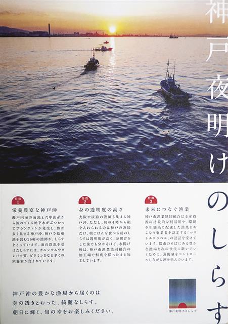 JF神戸市漁協の前浜、神戸沖には多種多様な魚介類を育む豊かな海が広がる。同漁協ではシラス、マダイ、ハモ、サワラ、タコなどが水揚げされているほか、ノリ養殖なども行われ、漁業者をはじめ市民も含めて海の…