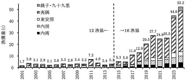 【千葉】千葉県水産総合研究センターは10日、トラフグの漁獲状況と標識放流試験の結果を公表した。漁獲量は2017年漁期(4月~翌年3月)以降増加しており、24年漁期は52・2トンで、00年以降の最大…
