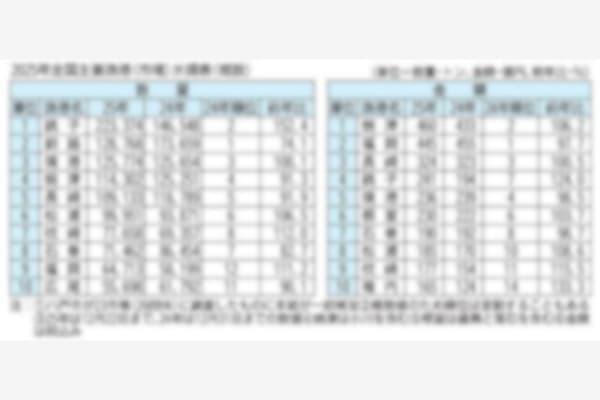 八戸市がまとめた2025年の全国主要漁港(市場)水揚高(概数)によると、数量は銚子が3年ぶりにトップへと返り咲いた。24年まで2年連続で首位だった釧路は2位だった。3位境港、4位焼津、5位長崎、6…