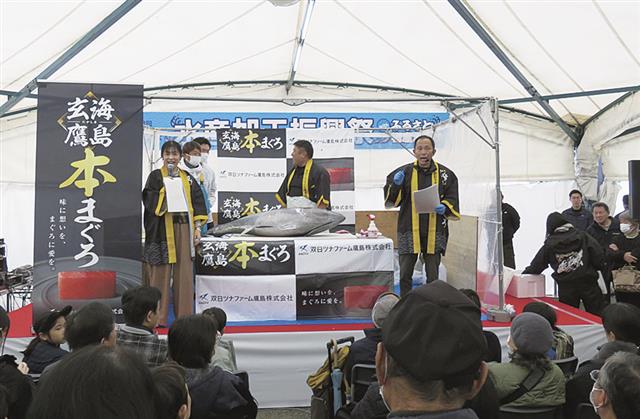 長崎県水産加工振興祭の関連行事である展示即売会の2日目に当たる13日の土曜日、会場である長崎市元船町のおくんち広場では恒例のマグロ解体ショーおよび即売会が開かれた。 加工振興祭の販売が午前10時か…