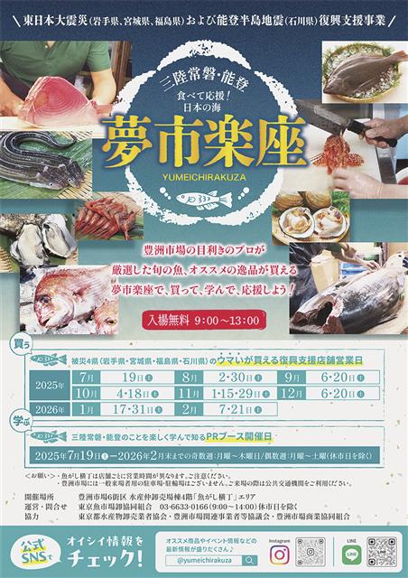 東京魚市場卸協同組合(東卸、早山豊理事長)は、東日本大震災と能登半島地震の被災4県の復興支援事業「三陸常磐・能登 夢市楽座」の3年目の詳細をこのほど明らかにした。サブタイトルは「食べて応援! 日本…
