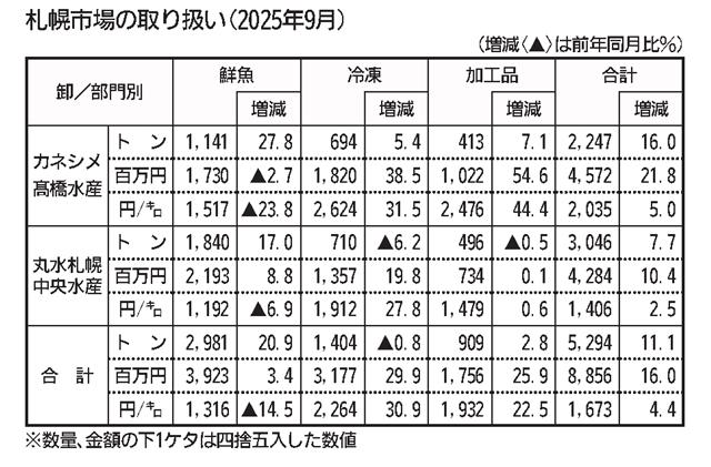 【札幌】札幌市中央卸売市場によると、同市場の9月の取扱高は生鮮サンマやスルメイカの増加により、5294トン(前年同月比11・1%増)、88億5600万円(16%増)と、8か月ぶりに数量、金額ともに…