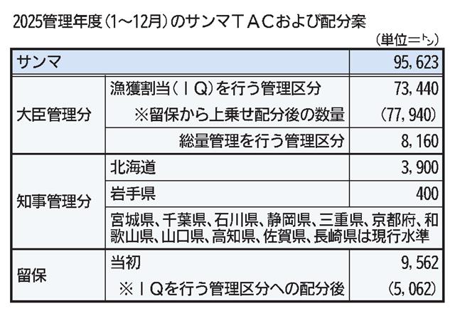 水産庁は21日、サンマの2025管理年度(1~12月)漁獲可能量(TAC)変更に関する意見交換会を、同庁会議室でウェブを併用して開催した。前年TACと同量で設定していた11万911トンから、3月の…
