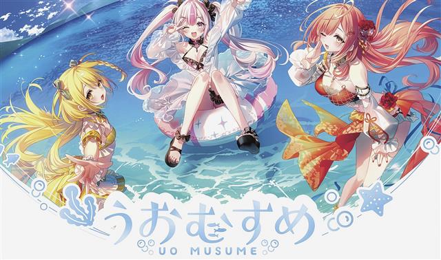 中央が「桃川ニジマス」、(右)が「紅波マダイ」、(左)が「黄金マアジ」。キャラクターの各所に魚に詳しい人間でないと分からない凝ったデザインが施されている 魚をモチーフにしたキャラクターによるバーチャ…