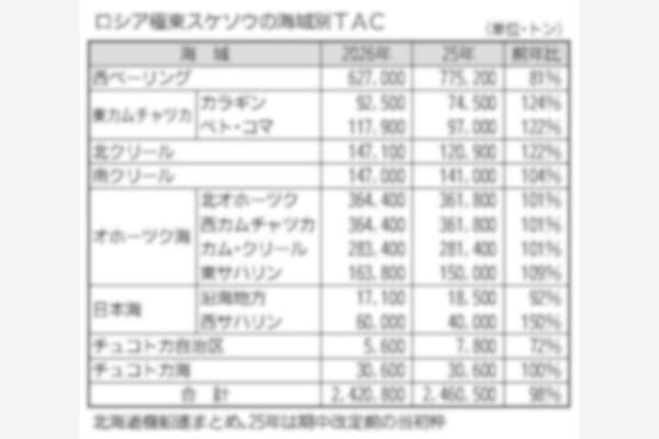 【札幌】北海道機船連によると、世界最大のスケソウ供給国であるロシアの来年の漁獲可能量(TAC)は、242万800トンの高水準で決まった。ロシア農業省が23日付命令で承認した。 春に科学研究機関が示…