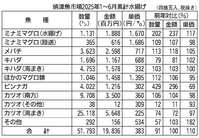【焼津】JF焼津漁協はこのほど、焼津魚市場の1~6月累計水揚げ概況をまとめた。数量は5万1793トン(前年同期比8・6%減)、金額は198億3634万円(0・2%増)、キロ平均単価は383円(9・…