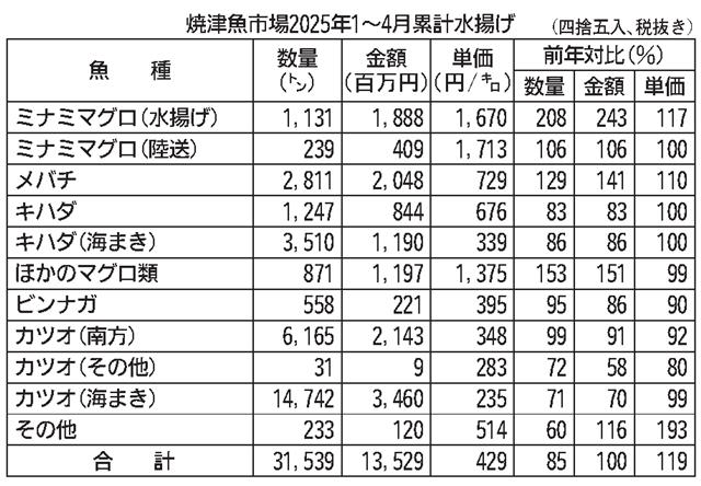 【焼津】JF小川漁協は小川魚市場の2025年1~4月累計水揚げをまとめた。数量は3953トン(前年同期比6・9%増)、金額は8億1608万円(49・4%増、税込み)、キロ平均単価は206・5円(3…