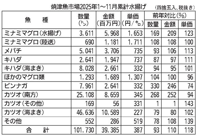 【焼津】JF焼津漁協は焼津魚市場の2025年1~11月累計水揚げ概況をまとめた。数量は10万1730トン(前年同期比6・9%減)、393億8514万円(10・1%増、税抜き)、キロ平均単価は387…