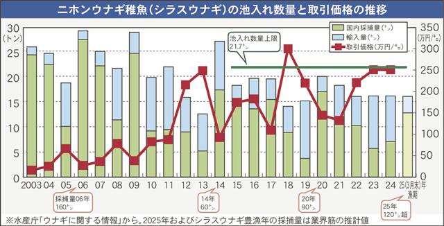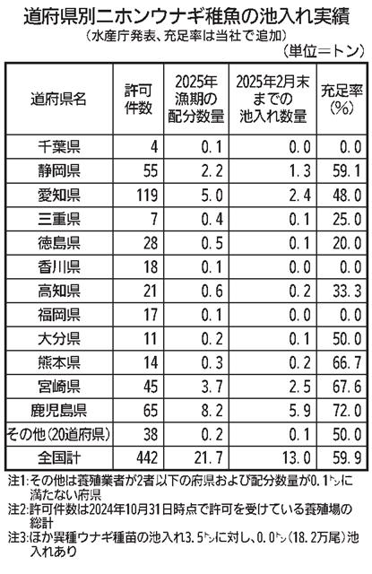 2025年漁期のニホンウナギの稚魚採捕が03年以降では2番目に相当する東アジア全体で120トン超えの豊漁年となっていながら、日本国内の養殖池への池入れペースが遅い。業界の推計では3月末時点で16・…