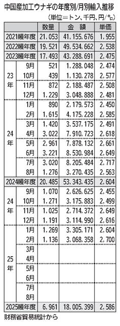 財務省の貿易統計によると、2月の中国産加工鰻(ウナギ蒲焼)の輸入は、数量で1136トン(前年比30%減)と大きく減らした。堅調な業務用需要を背景に1000トン台は13か月連続でキープしたものの、ニ…
